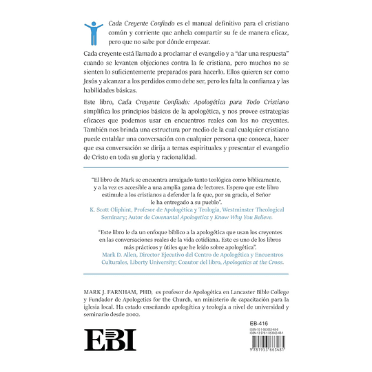 Para los cristianos ordinarios que desean compartir su fe de manera efectiva, pero no saben por dónde empezar, "Cada creyente confiado" es el libro que estaban esperando. Todo creyente está llamado a proclamar el evangelio y “dar una respuesta” cuando se plantean objeciones contra la fe cristiana, pero muchos se sienten mal equipados para hacerlo. Quieren ser como Jesús e involucrar efectivamente a los perdidos, pero carecen de la confianza y las habilidades básicas. "Cada creyente confiado: Apologética para todo cristiano" simplifica los principios elementales de la apologética y proporciona estrategias efectivas para usar en encuentros reales con incrédulos. Proporciona una estructura mediante la cual cualquier cristiano puede involucrar a cualquier persona que conozca, llevar la conversación a asuntos espirituales y presentar el evangelio de Cristo en toda su gloria y racionalidad.