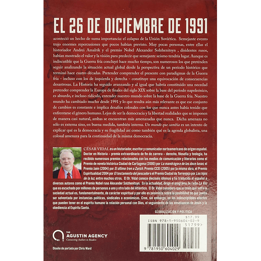 El 26 de diciembre 1991, tuvo lugar un hecho de extraordinaria importancia en la Historia universal. Se trató de la disolución de la Unión Soviética, un acontecimiento de enormes repercusiones que pocos habían previsto. A decir verdad, sólo el historiador Andrei Amalrík y el premio Nobel Alexander Solzhenitsyn , disidentes rusos, habían tenido el valor y la visión para anunciar que semejante seísmo tendría lugar. Aunque es indiscutible que la Guerra fría concluyó, no son pocos los que pretenden seguir analizando la situación actual del globo desde la perspectiva de un período histórico que terminó hace cuatro décadas. Pretender comprender el presente con paradigmas de la Guerra fría - incluso con los de izquierdas y derechas - constituye una equivocación de consecuencias perjudiciales. La Historia ha seguido avanzando y al igual que habría constituido una necedad pretender comprender la Europa de finales del siglo XIX sobre lo que fue la vida de Napoleón, destronado definitivamente en 1815, es absurdo, e incluso ridículo, entender nuestro mundo sobre la base de la Guerra fría. Nuestro mundo ha seguido cambiando desde 1991 y lo que resulta aún más relevante es que ese conjunto de cambios es constante e implica desafíos colosales con los que nunca antes ha tenido que enfrentarse el género humano. Lejos de ser la democracia y la libertad realidades que se imponen de manera casi natural, lo cierto es que se encuentran más amenazadas que nunca y que esa amenaza no sólo es externa sino, en buena medida, también interna. Un mundo que cambia es un intento de explicar que es verdaderamente la democracia y su fragilidad, y que es la agenda globalista, la cual amenaza a el patriotismo y la continuidad de la misma democracia.